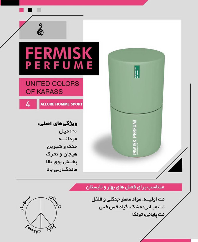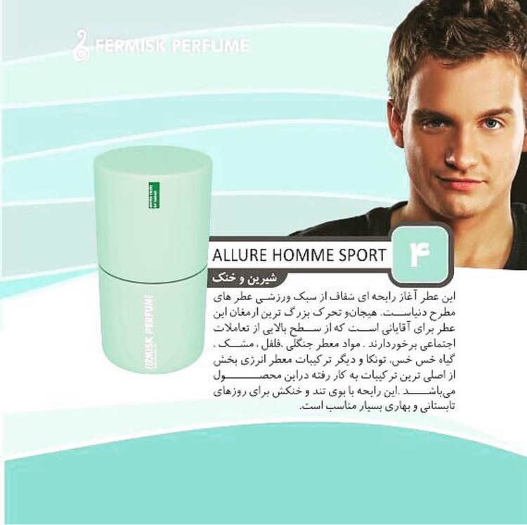 فرمیسک شماره ۴ با الهام از عطر فوقالعادهی Allure Homme Sport از برند شنل (Chanel)، انتخابی بینقص برای آقایانیست که دنبال رایحهای اسپرت، خنک، لوکس و خاص هستن؛ عطری که تو اولین اسپری، شخصیتی جسور و مدرن از شما به نمایش میذاره.