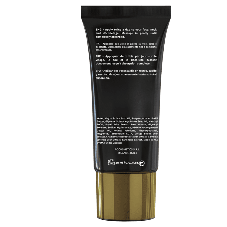 Oryza Sativa Bran Oil, Butyrospermum Parkii Butter, Glycerin, Sclerocarya Birrea Seed Oil,Matrixyl 3000, Royal Jelly Extract, Beta Glucan, Sodium Hyaluronate, Retinyl Palmitate, Ginkgo Biloba Leaf Extract, Chamomi Recutita Flower Extract, Camellia Sinensis Leaf Extract, Laminaria Extract